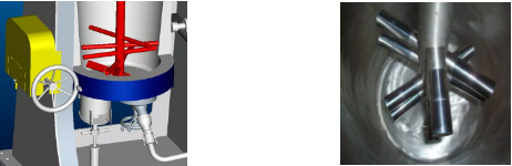 (1)攪拌器設(shè)計:具有特殊設(shè)計的攪拌器:上面是帶硬質(zhì)合金套筒的攪拌臂,不銹鋼攪拌軸。最下面是一特殊設(shè)計的提升攪拌臂,可以將研磨缸底部的磨介和物料全部翻騰起來??朔似渌心C底部有死角、研磨不均勻的弊病。
